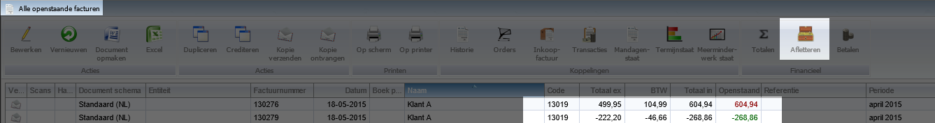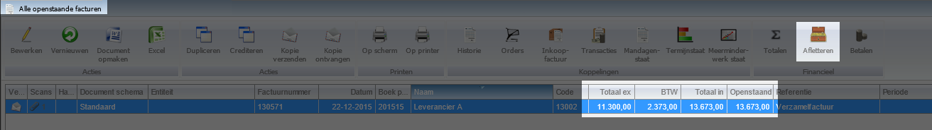 Het kan voorkomen dat je een factuur wilt afletteren op een inkoopfactuur die nog betaald moet worden, zodat deze tegen elkaar weg vallen of dat er nog een deel overblijft wat je nog moet ontvangen. In dit voorbeeld gebruiken we een factuur van € 13.673,00 die we nog moeten ontvangen en een inkoopfactuur van € -12.098,79 die we nog moeten betalen, het verschil wat overblijft zal € 1.574,21 zijn wat we nog moeten ontvangen Ga naar alle openstaande facturen en selecteer de regel welke je wilt afletteren en klik op de knop Afletteren