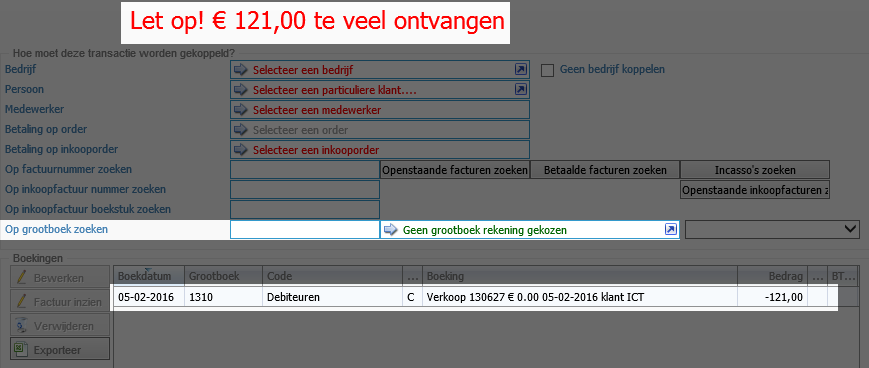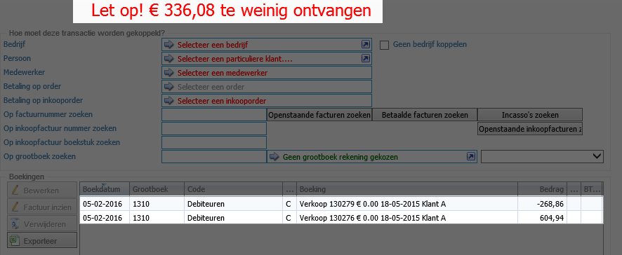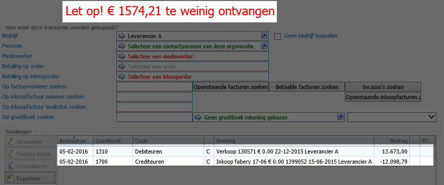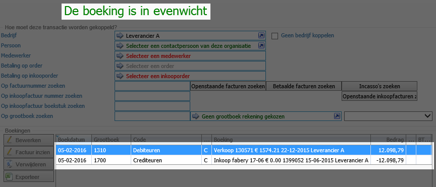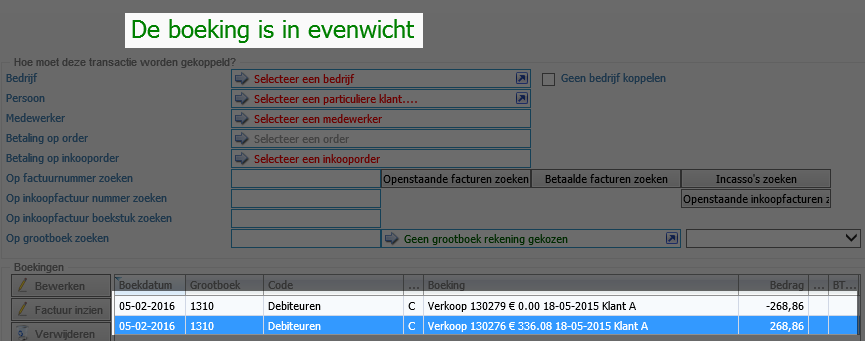 Er zal nu een transactie scherm worden geopend, met onderin de regels van de facturen. Je ziet dat hij nog niet in evenwicht is, dit komt omdat het bedrag van de factuur wat je nog moet krijgen in dit geval hoger is dan het bedrag wat je moet betalen.