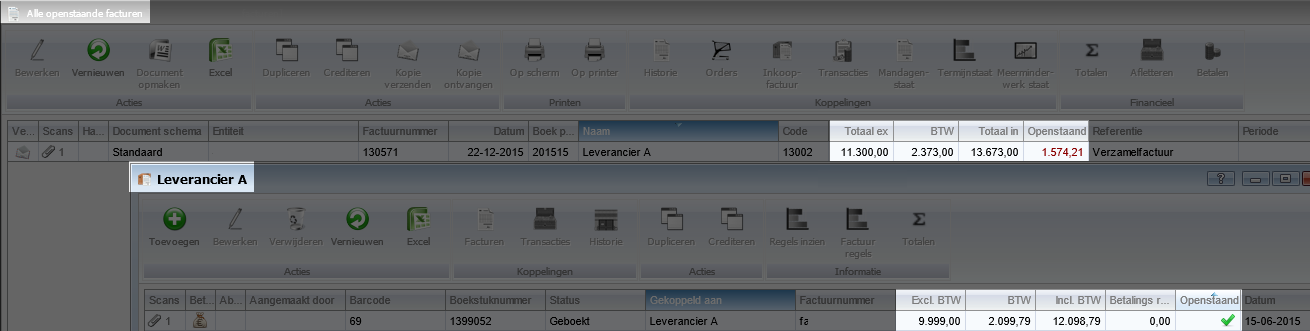 Als je nu weer terugvalt in het scherm van alle openstaande facturen openstaande bedrag van de factuur is aangepast. Als je de inkoopfactuur zal opzoeken zal je zien dat deze als betaald staat Dit is nu met elkaar verrekend