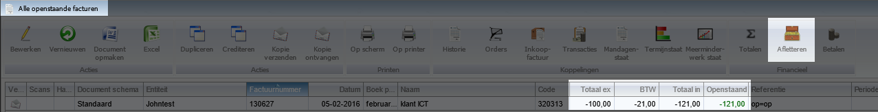 Het kan voorkomen dat je een factuur wilt afletteren op een grootboekrekening, zodat deze hierop wordt afgeletterd. Dit kunnen verschillende grootboekrekeningen zijn In dit voorbeeld gebruiken we een factuur van € -121,00 deze boeken we weg op het grootboek inhuur extern Ga naar alle openstaande facturen en selecteer de regel welke je wilt afletteren en klik op de knop Afletteren