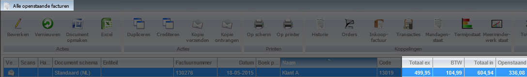 Als je nu weer terugvalt in het scherm van alle openstaande facturen zal je zien dat de credit nota er niet meer tussen staat en het openstaande bedrag van de andere factuur is aangepast. Dit is nu met elkaar verrekend