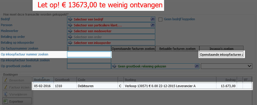 Zoek hierin de inkoopfactuur welke je wilt afletteren en klik op selecteren Je komt nu weer terug in het transactie scherm, met onderin de regel van de factuur en inkoopfactuur. Je ziet dat hij nog niet in evenwicht is, dit komt omdat het bedrag van de factuur wat je nog moet krijgen in dit geval hoger is dan het bedrag wat je moet betalen.