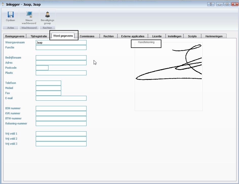 Zorg dat je de handtekening als .png bestand op je systeem hebt staan. Dit kan je doen door je handtekening in te scannen en op te slaan als .png bestand. Ga dan in Hybrid SaaS naar de gebruikerskaart van de eigenaar van de handtekening. (Gebruikers wijzigen). Op het tabblad Word gegevens kan je de handtekening uploaden.
