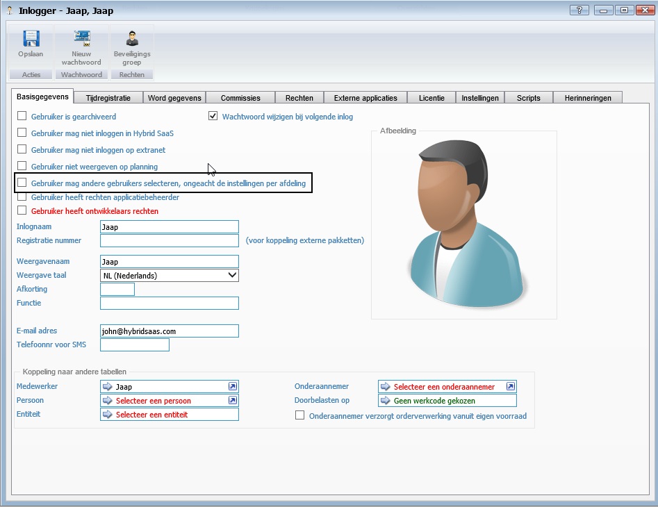 Als je besluit dat een gebruiker rechten moet hebben om voor iedere gebruiker een handtekening te plaatsen dan doe je dit op de gebruikerskaart. Je zet dan het recht Gebruiker mag andere gebruikers selecteren, ongeacht de instelling per afdeling.
