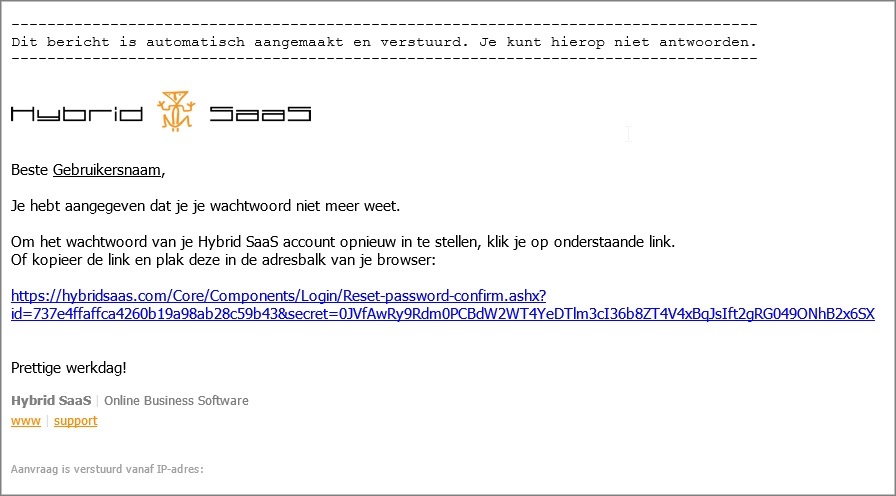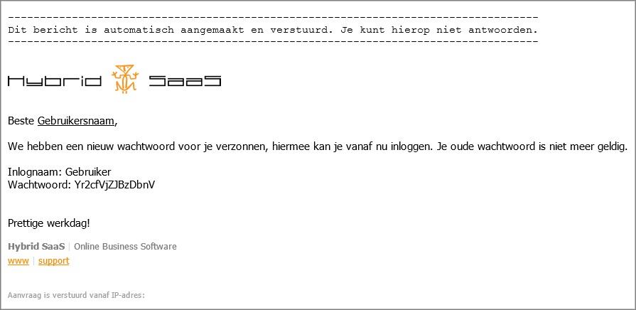 Zodra je deze optie kiest wordt er een e-mail gestuurd naar de gebruiker. Deze ontvangt onderstaand bericht en kan nu inloggen met de nieuwe inlognaam en wachtwoord.
