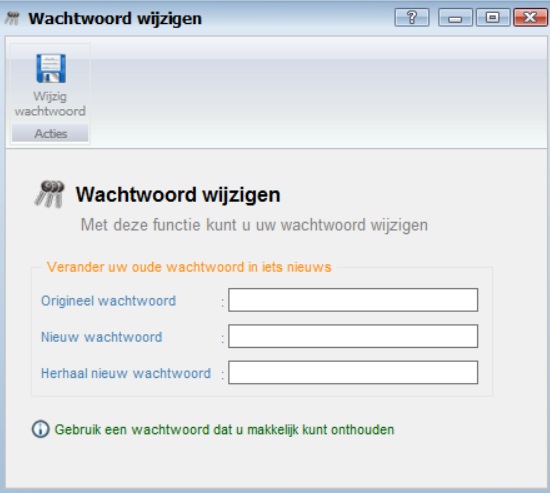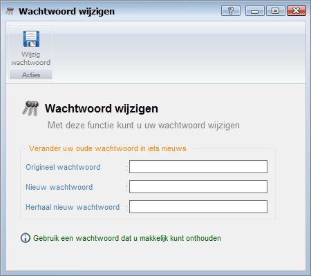 Vul bij het Originele wachtwoord het via de e-mail ontvangen wachtwoord in en vervolgens bijNieuw wachtwoord en bij Herhaal wachtwoord je nieuwe wachtwoord in en druk op de knop Wijzig wachtwoord.