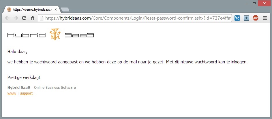 In de zojuist ontvangen e-mail vind je de link om het wachtwoord reset uit te voeren. Klik op deze link om het wachtwoordherstel uit te voeren. Je internetbrowser opent met daarin een bevestiging van de aanvraag van het wachtwoordherstel. Je kunt dit venster of tab afsluiten.