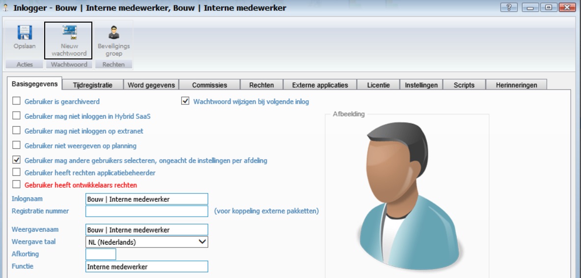 Zodra een gebruiker is aangemaakt moet je deze op de hoogte brengen van zijn inlog-id. en zijn initiële wachtwoord. Hiervoor zit er bij het gebruikers scherm bovenin het scherm een knop Nieuw wachtwoord.