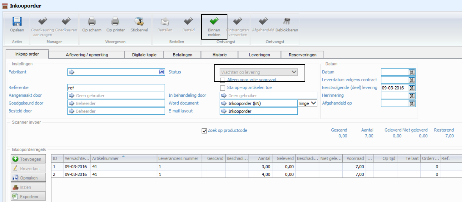 Hier staat een inkooporder op de status Wachten op levering . Zodra de spullen binnen komen gaan we deze d.m.v. de knop Binnen melden in ontvangst nemen. Maar dit doen we niet in het standaard magazijn maar in een Retour leverancier magazijn. (Deze moet dan wel bestaan, anders moet je deze aanmaken).