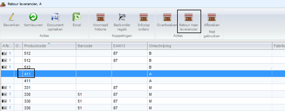 Selecteer het juiste product en druk op de knop Retour naar leverancier .