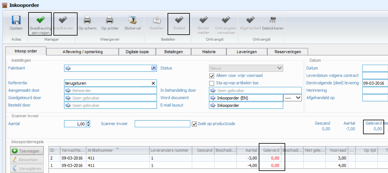 Open de inkooporder. Loop nu het proces door. Goedkeuring aanvraag, goedkeuren manager en als laatste de knop Besteld” . De order hoeft niet binnen gemeld of in ontvangst te worden genomen. De voorraad wordt meteen weer afgeboekt.