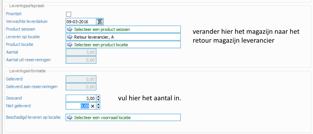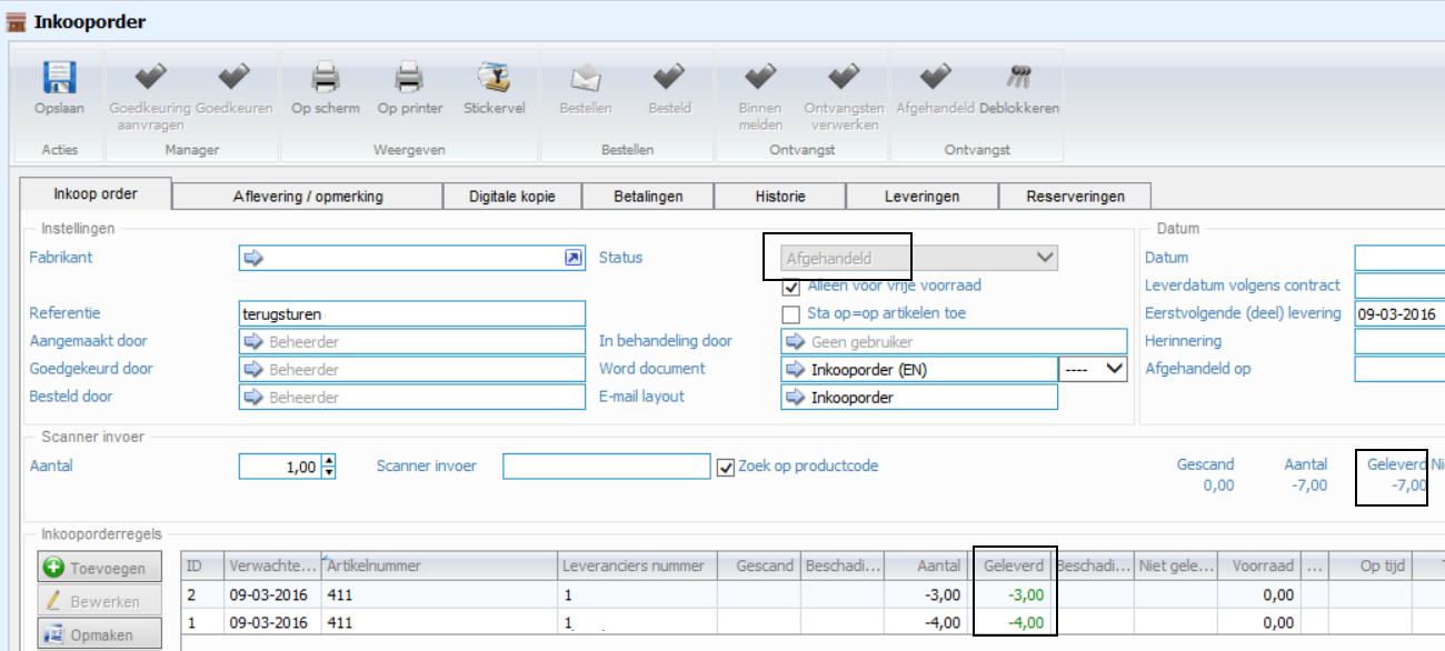 LET OP! Bij geleverd dient het aantal stuks in de min - weergegeven te worden. Als dit niet het geval is zal de voorraad niet worden verwerkt en worden afgeboekt.