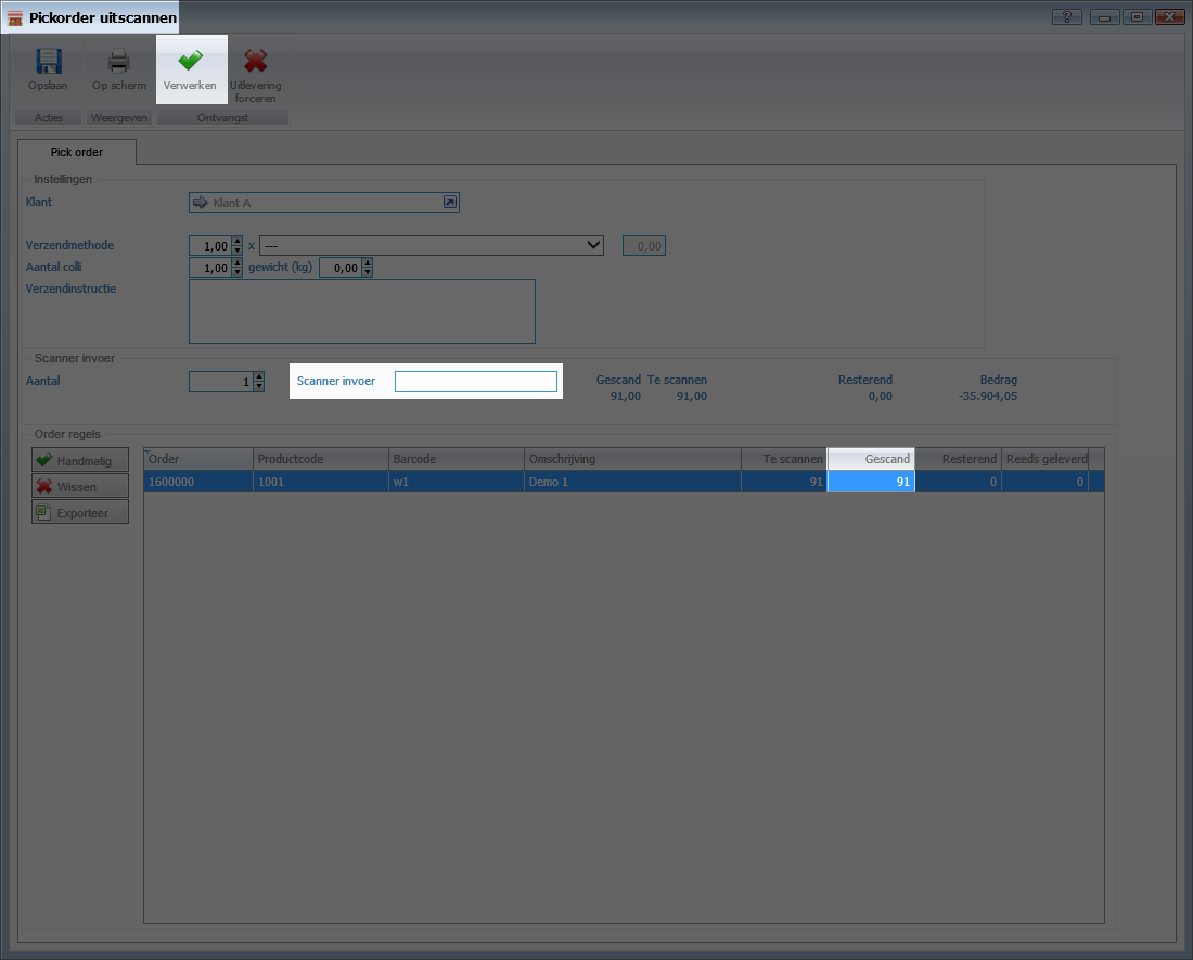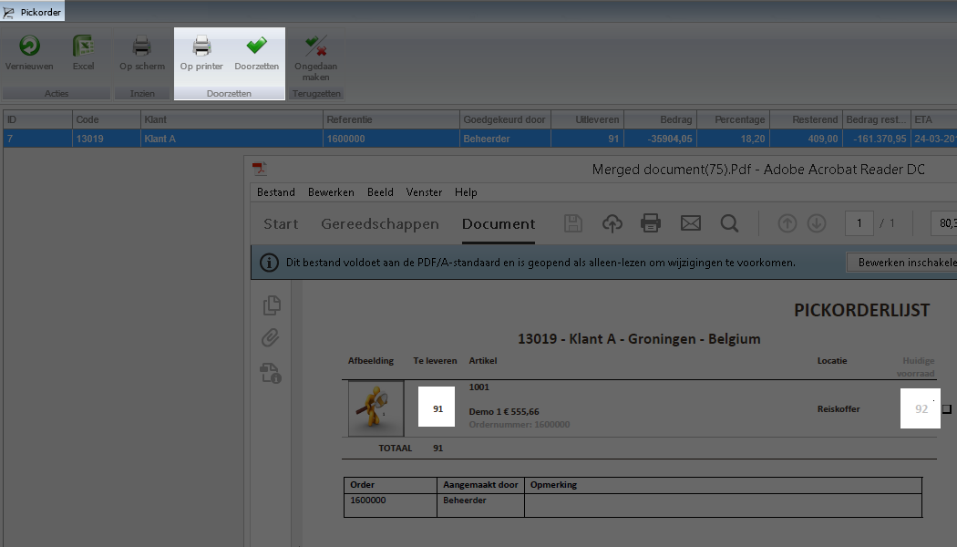 Magazijn zet de picklijst door via de printer, het systeem maakt de bon, op de bon zie je de 91 stuks staan, ook kan magazijn direct een controle houden, er moeten er namelijk 92 in het schap liggen, er blijft er 1 over voor een andere order. Is dit niet het geval dan moeten zij dit melden aan de inkoopafdeling.
