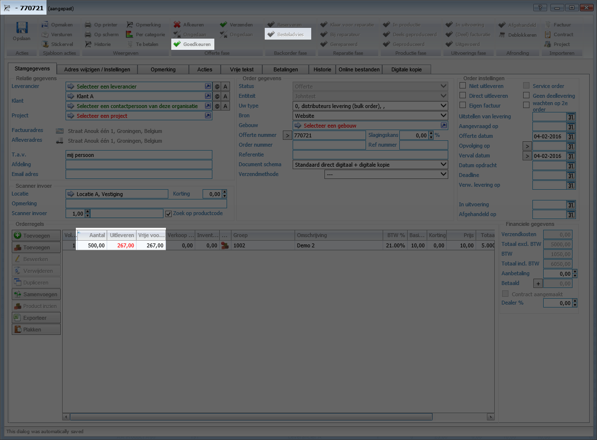 Lever uit wat ik heb en de rest bestellen, klik op goedkeuren, reserveren, de order komt in het pickorder proces.