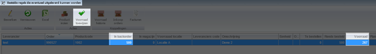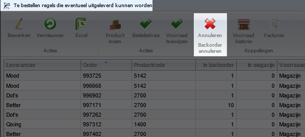 - Op voorraad: hier staan backorder regels in die nog niet op het besteladvies staan, maar wel op voorraad zijn volgens het systeem