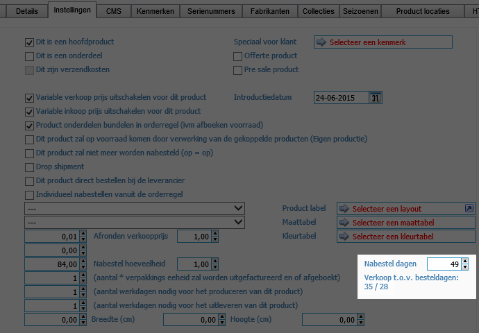 Dit kan het systeem ook automatisch doen voor je. Als je op de klantenkaart dit aan zet, (bedoeld voor distributeurs, zodat ze je voorraad niet opkopen) Het systeem kijkt naar het aantal nabestel dagen wat nodig is om het hier te krijgen, dus in dit geval 49 dagen. In de afgelopen dagen zijn er 35 verkocht, in de aankomende 49 dagen in het voorgaande jaar 28. Het systeem zal 35 aanhouden als planvoorraad, zodat je aan normale klanten geen nee hoeft te verkopen.