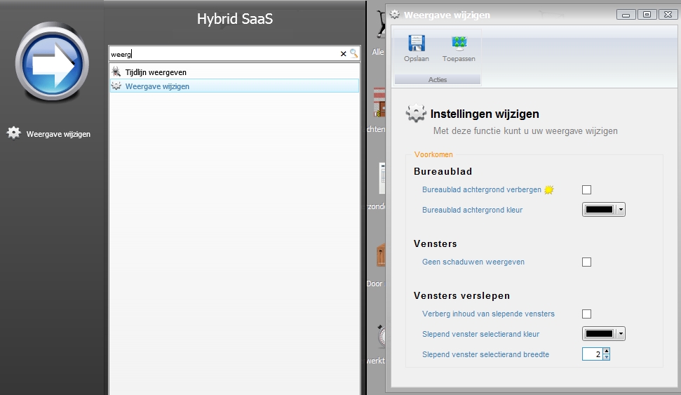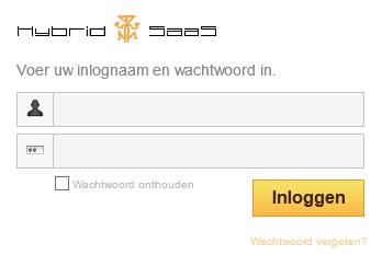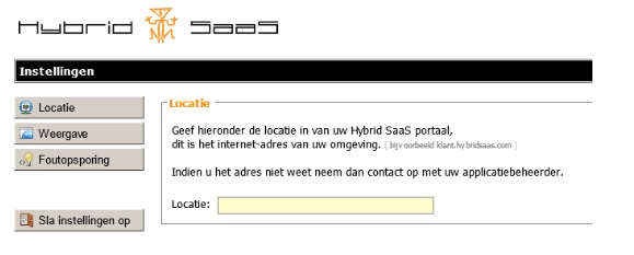 Op je desktop staat nu het Hybrid SaaS logo, waarmee je de applicatie kan starten. Bij de eerste keer opstarten vraagt het systeem nog om een locatie, dit is het internetadres van je omgeving. Dit is bedrijfsnaam gevolgd door hybridsaas.com. (Indien deze niet in het bezit is, kan deze opgevraagd worden bij de supportafdeling) Gebruik de knop "Sla instellingen op" om deze instelling op te slaan.