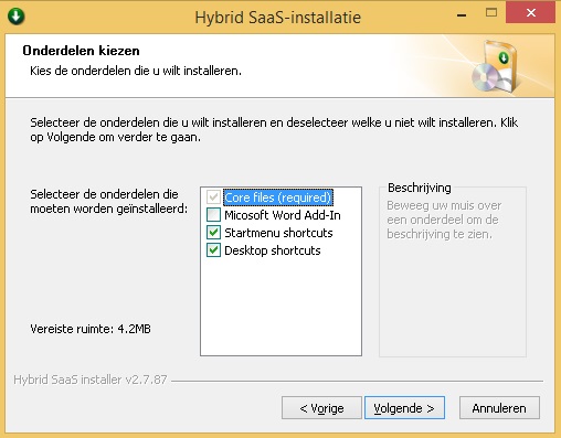Bij dit onderdeel staan standaard de Startmenu en Desktop shortcuts aan gevinkt. Het onderdeel Microsoft Word ADD-In kan je optioneel aanzetten. Dit doe je als je zelf word-sjablonen gaat maken of aanpassen. En klik op volgende om door te gaan.