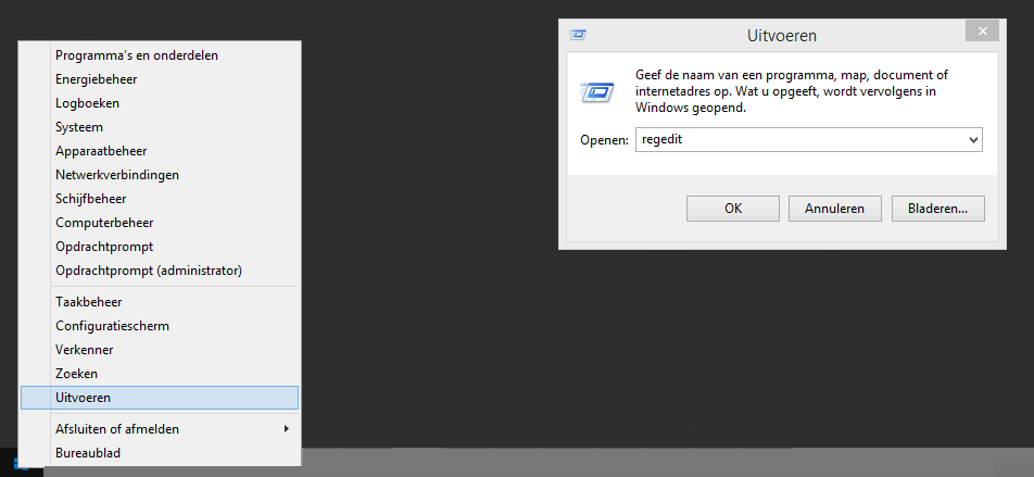 Ga dan naar regedit via de Windows knop - Uitvoeren