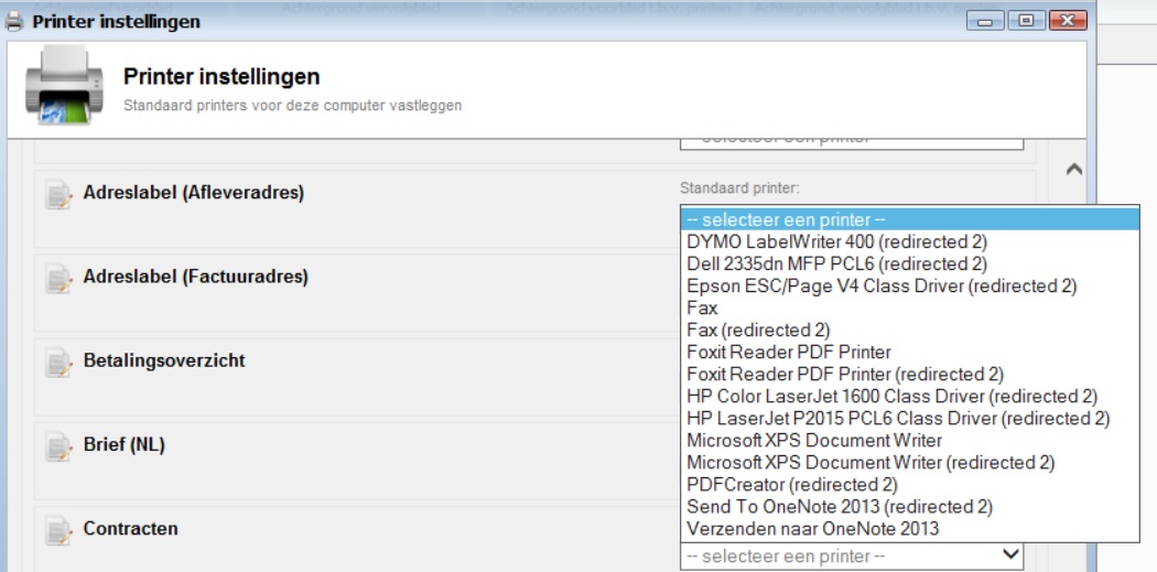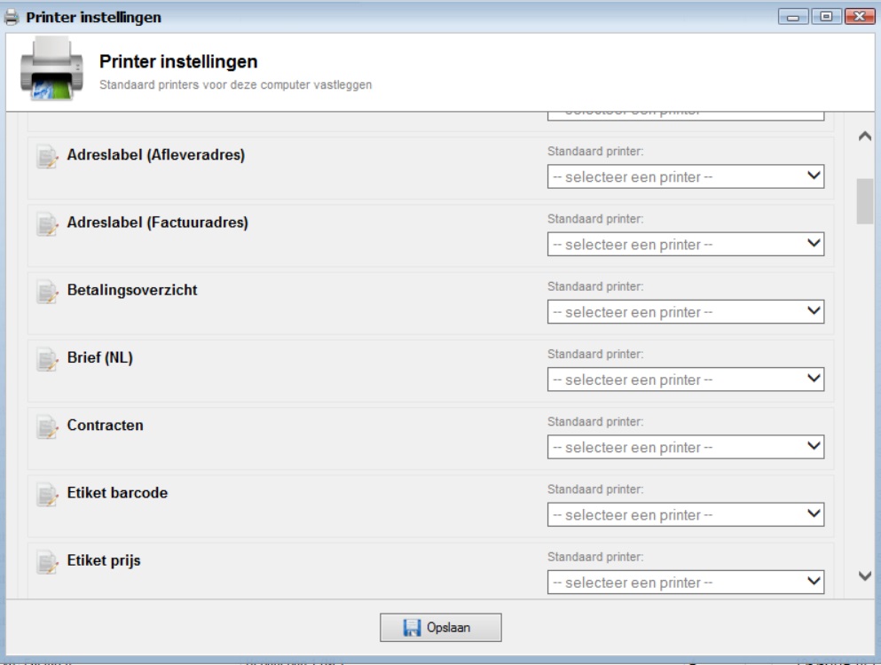 Als je de printer instellingen opent, dan verschijnt er een scherm met alle wordt sjablonen die gedefinieerd zijn. Zoek in de lijst met word-sjablonen het sjabloon op waar je een standaard printer aan wilt koppelen, door op het drop Down pijltje te klikken.