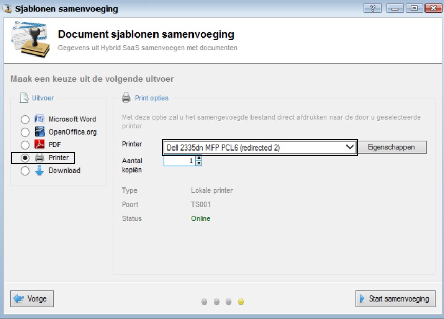 Als je nu de volgende keer een document gaat printen dan staat deze automatisch op de juiste printer. Klik op samenvoegen en het document wordt opgemaakt en naar de printer verzonden.