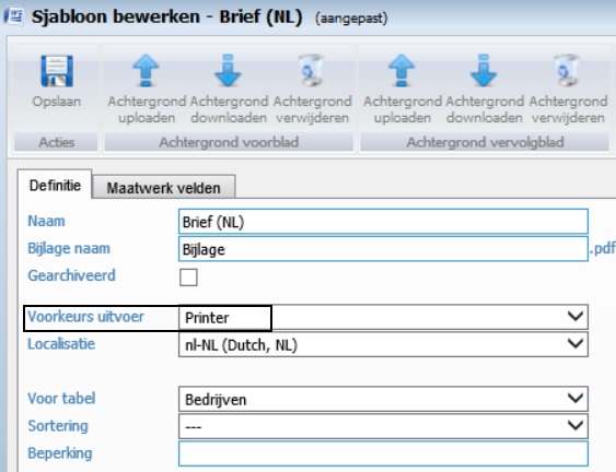 Kies het word-sjabloon waarvan je de standaard printer wilt instellen (dubbelklikken) Het word-sjabloon moet gekoppeld zijn aan een afdeling of het vinkje Weergeven bij iedereen staat aan. Anders komt deze niet zichtbaar in de lijst met printer instellingen. Controleer of dit klopt en anders pas dit aan.