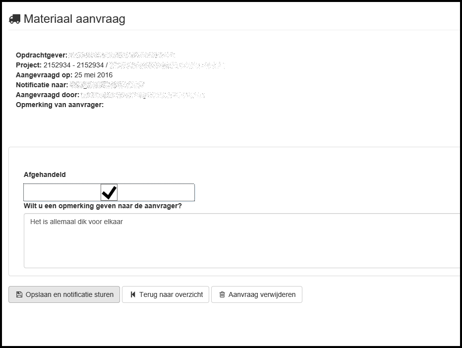 Het is ook mogelijk om alleen een opmerking te sturen, zolang het vinkje afgehandeld niet gekozen wordt zal deze beschikbaar blijven in de agenda. Indien de onderaannemer een fout heeft gemaakt kan de aanvraag ook verwijderd worden, De aanvrager krijgt hierover een status update.
