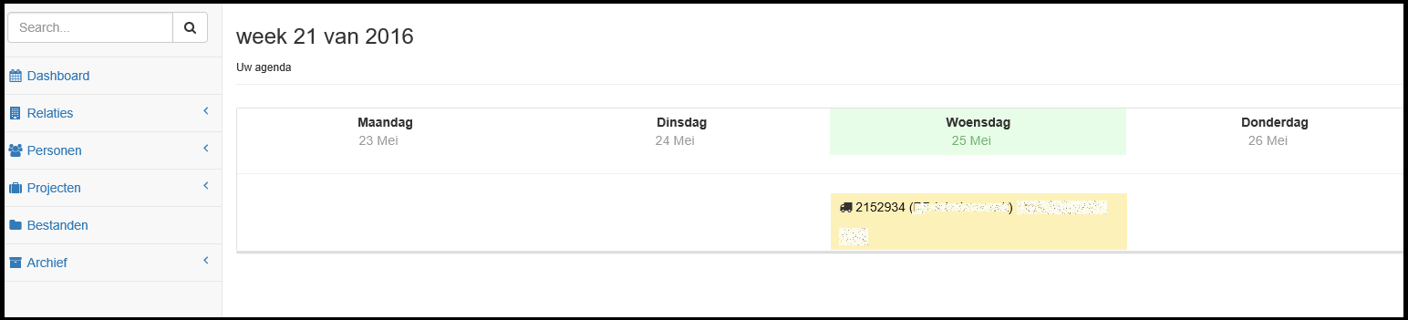 Wanneer de aanvraag is opgeslagen zal deze ook zichtbaar worden op de agenda op het dasboard, (eens in de zoveel minuten wordt het scherm geladen, er kan wat vertraging inzitten)