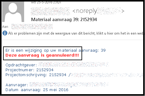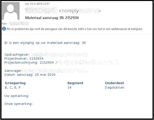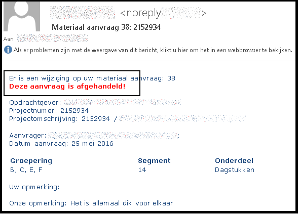 Op de gebruikerskaart moet een email adres bekend zijn anders stuurt het systeem geen terugkoppeling voor een materiaal aanvraag.