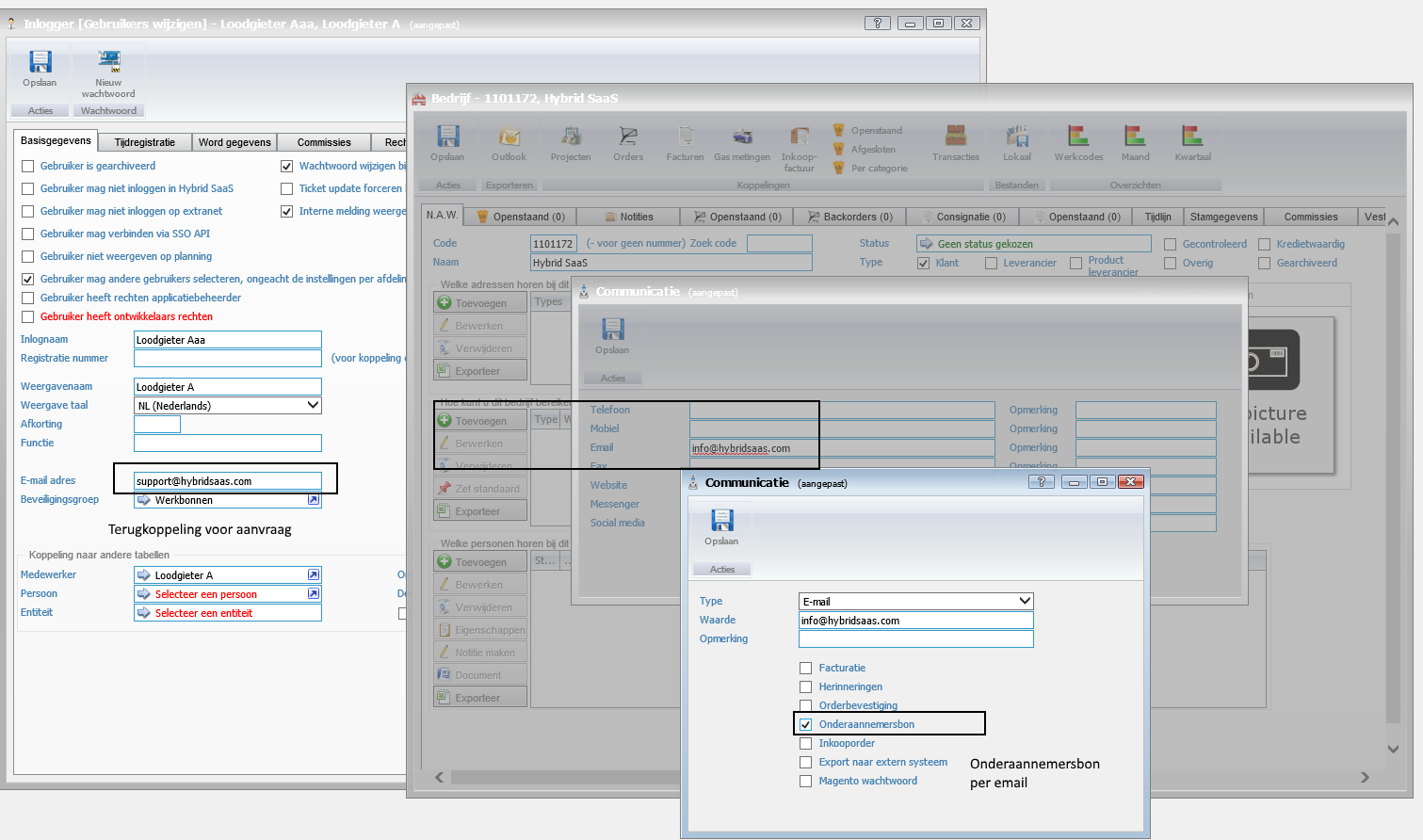 Op de relatiekaart moet het vinkje onderaannemers bon aanstaan bij het email adres anders krijgt de onderaannemer de bon niet in de email bij het aanmaken van bonnen.