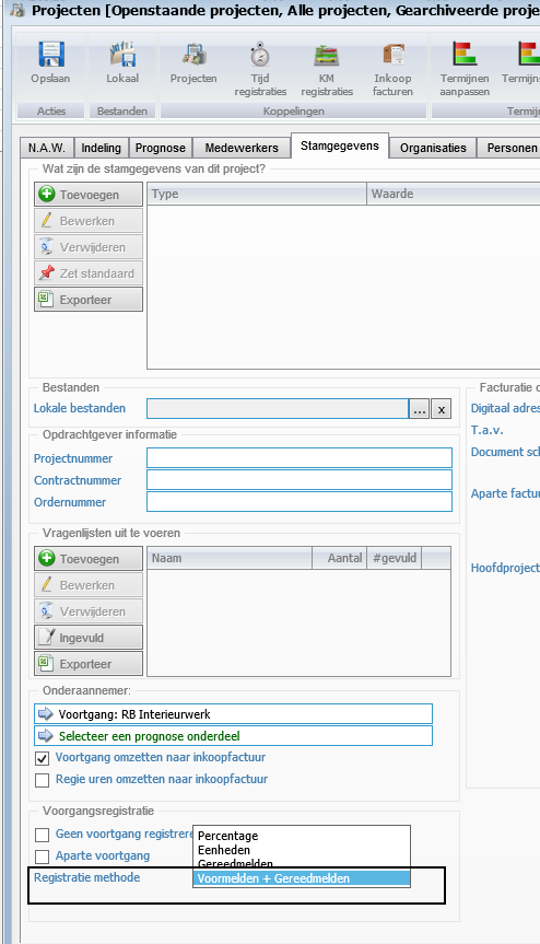Om het voormelden te activeren voor een project zal er een instelling op de projectkaart moeten worden aangepast. De registratiemethode moet staan op Voormelden + Gereedmelden