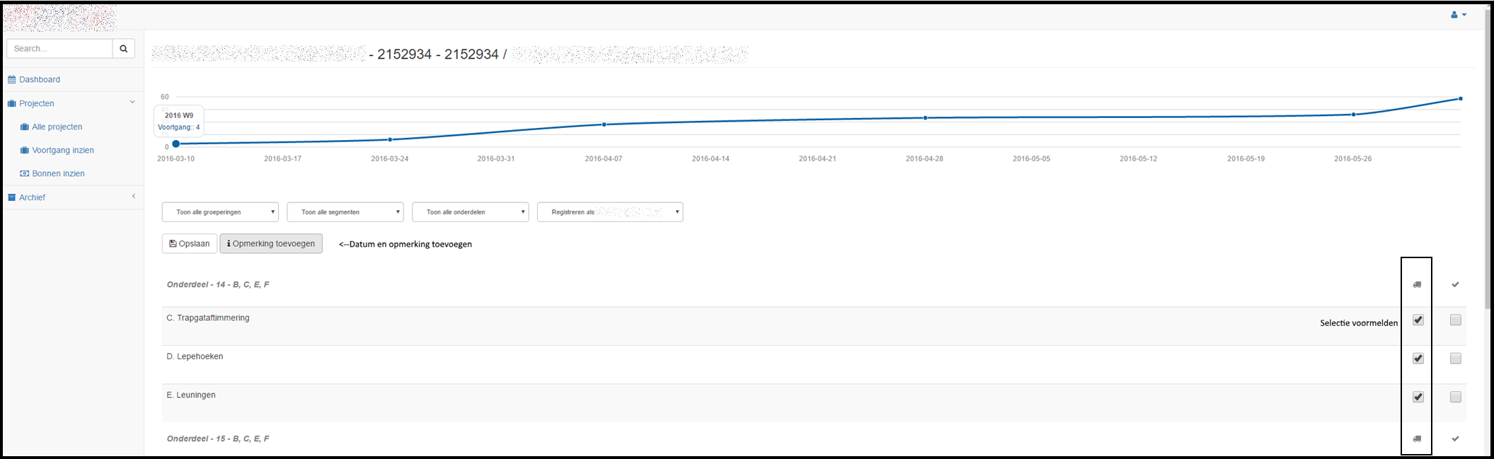 Onderaannemer kan bij voortgang doormiddel van vinkjes ook materiaal aanvragen.