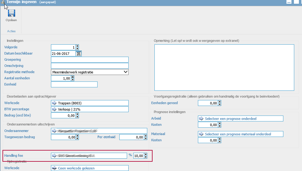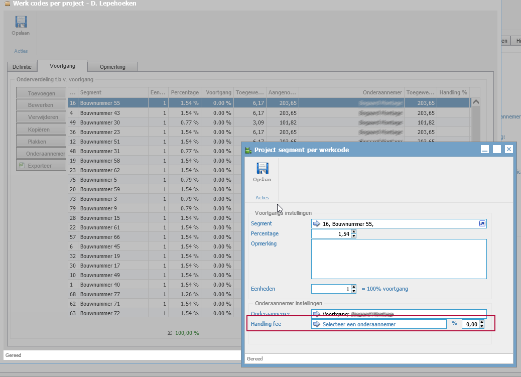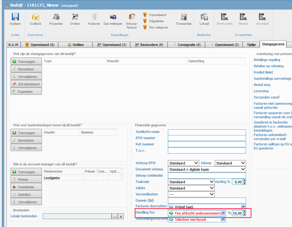 Op de leverancierskaart kan er aangegeven worden dat er een FEE moet worden afgedragen, hier kan de relatie worden gekoppeld. Via stamgegevens gaat 10% van de aanneemsom naar deze relatie toe,