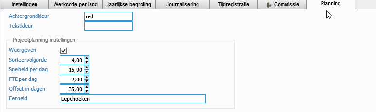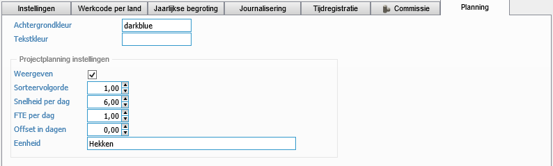 De eerste stap is de werkcodes goed zetten, per werkcode kan er op het tabblad Planning worden aangegeven wat voor soort kleur de balkjes moeten worden, het vinkje weergeven dient aangezet te worden. Eventuele parameters kunnen ingesteld worden deze hebben invloed op het automatisch laten berekenen voor de planning, en de naam van weergave dient aangegeven te worden