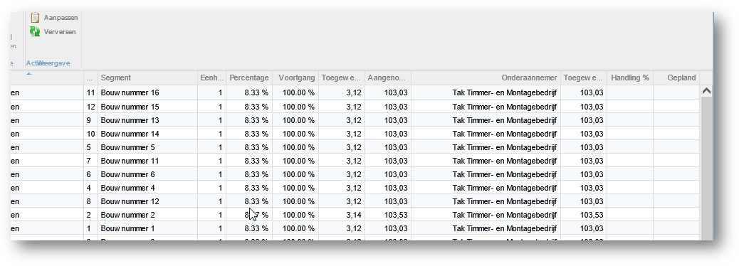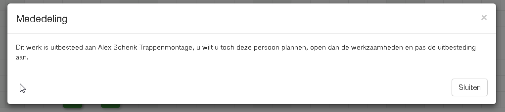 Indien er een besluit is om de onderaannemer om te boeken krijg je melding van het item die niet aangepast zijn, vervolgens wordt er een overzicht getoond van alle onderdelen en de toewijzing, (ook of hij al gepland is, want dan gaat hij ook niet over naar de andere onderaannemer, dat moet via planbord aangepast worden)
