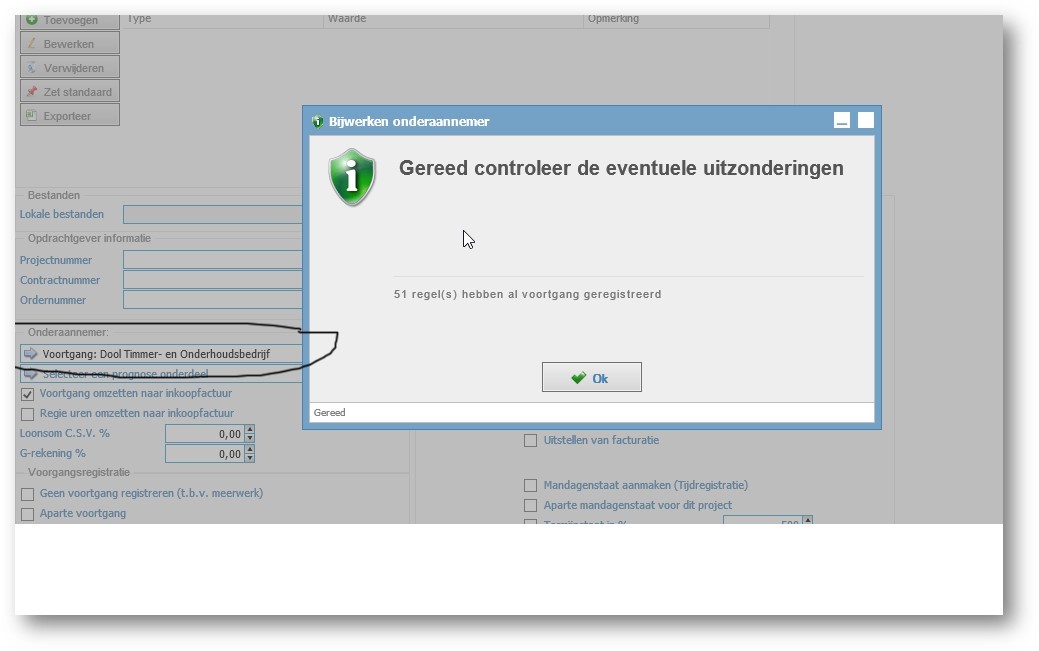 Het systeem vraagt dan voor een overeenkomst voor de combinatie onderaannemer / project,