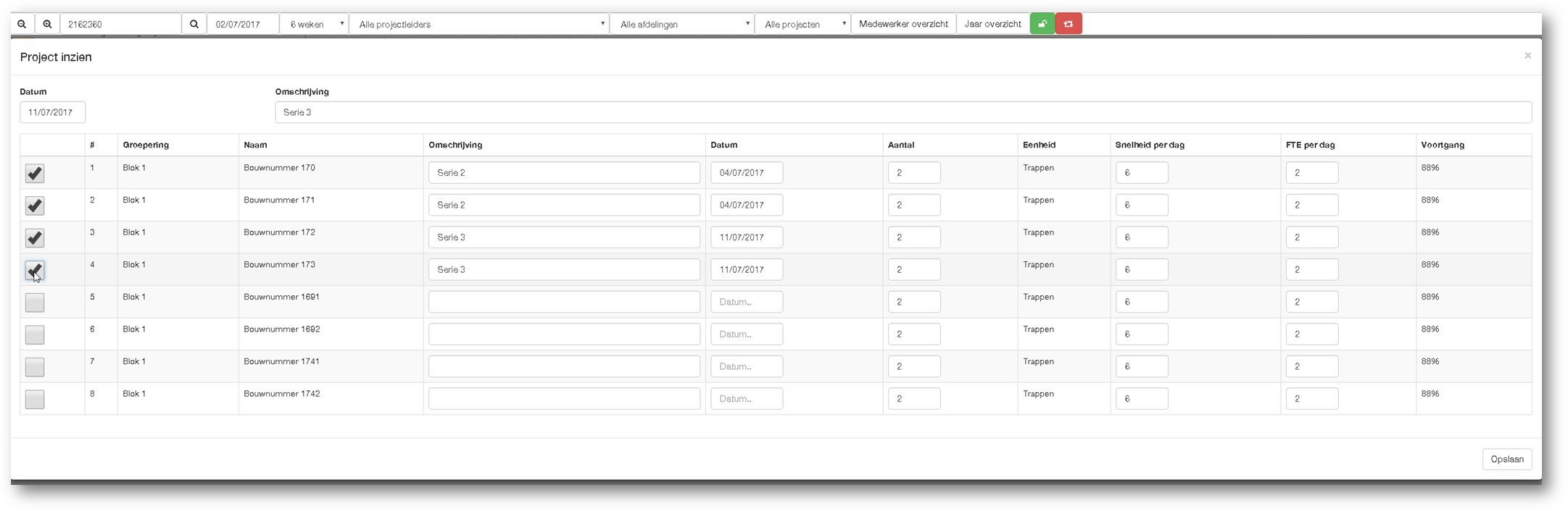 In dit voorbeeld is aangegeven dat serie 1 vandaag valt, serie 2 de week erna, en serie 3 2 weken later dan serie 1 Systeem rekent dan uit op basis van de parameters in de werkcodes wat de planning wordt.