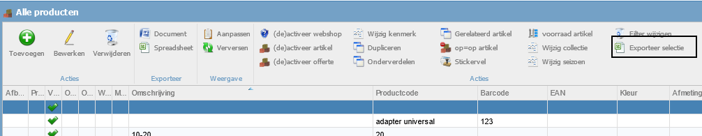 Om te importeren selecteer het aantal producten welke gewenst zijn, dit mag er ook 1 zijn. en kies voor exporteer selectie