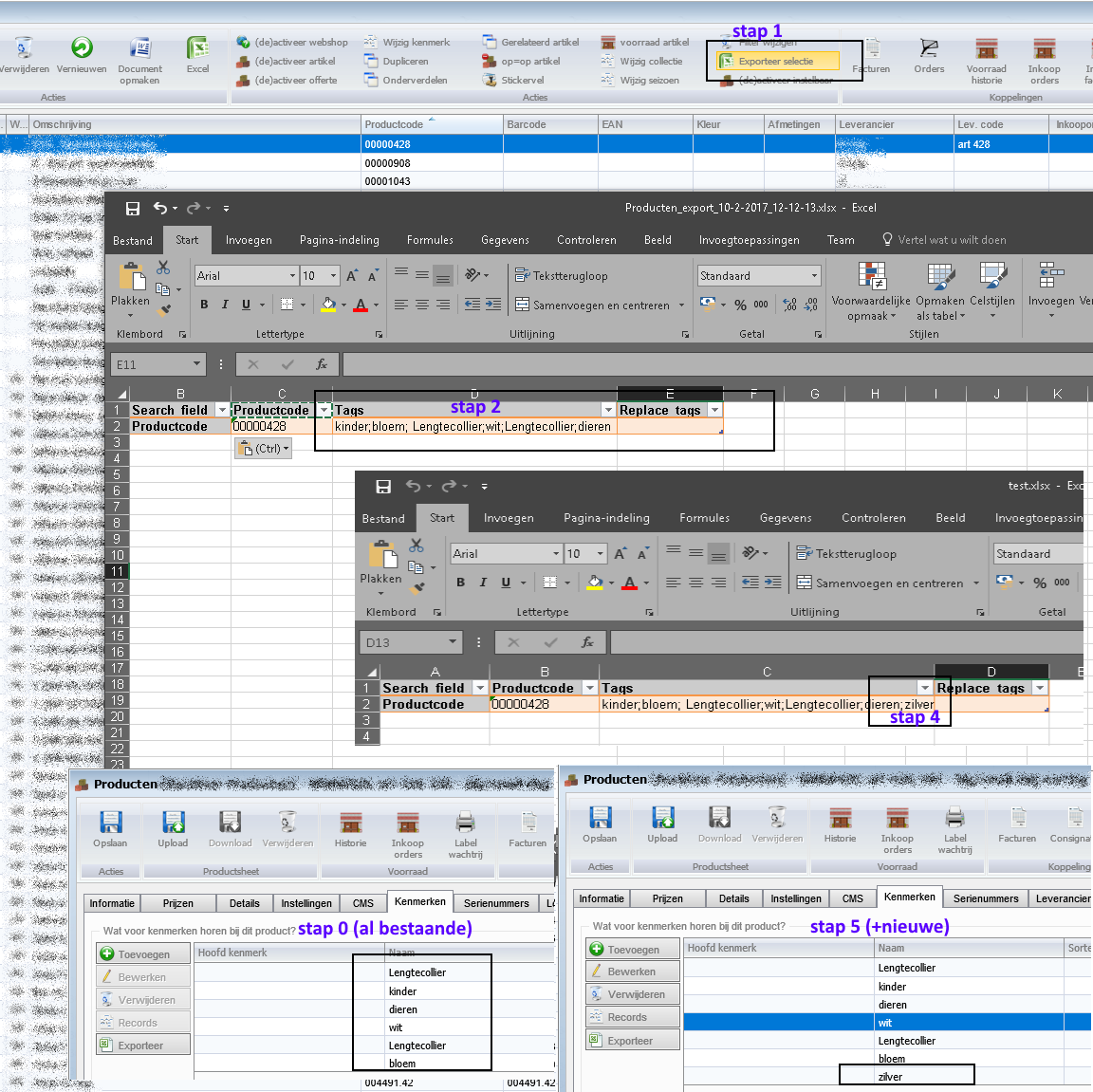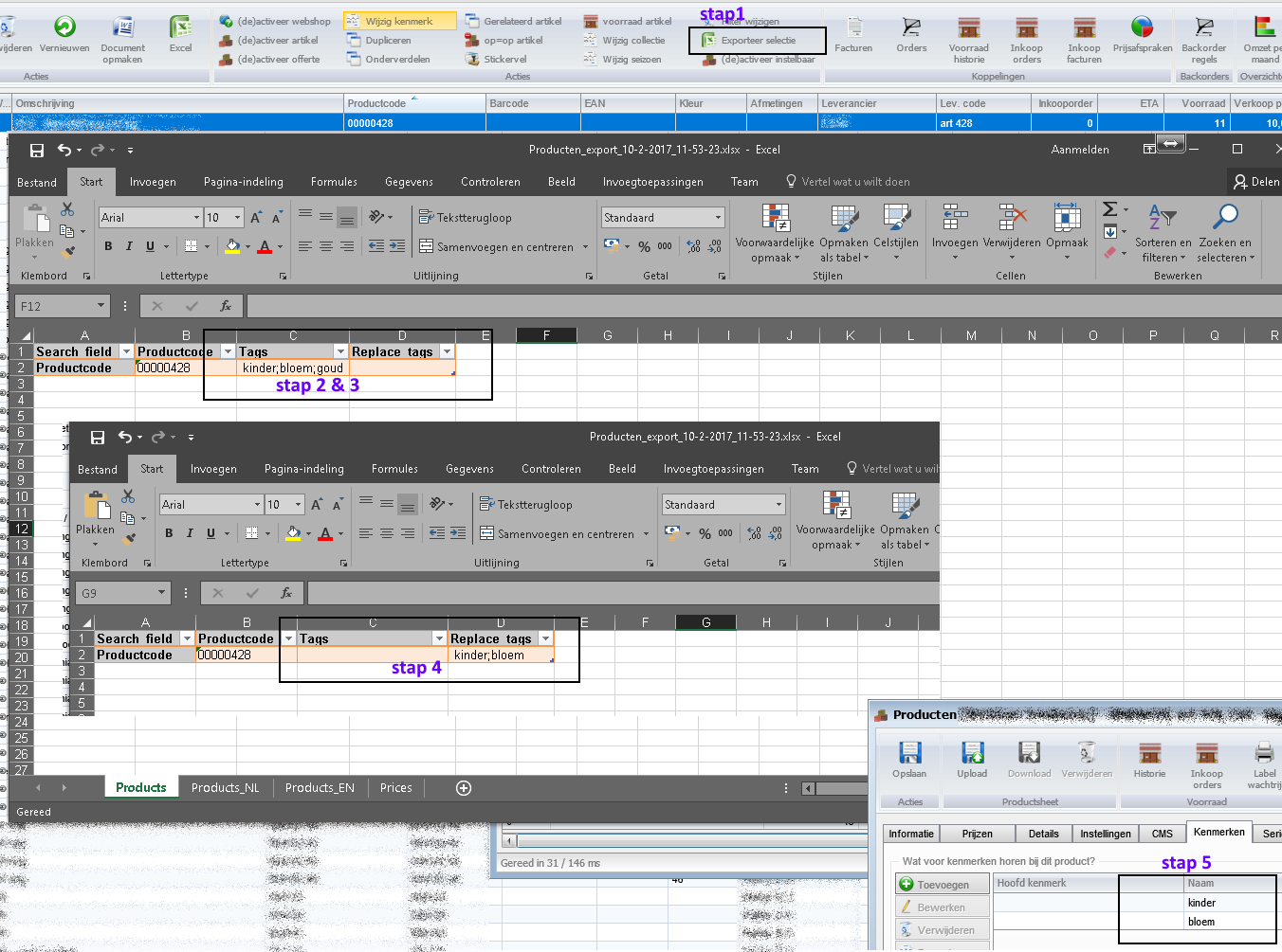 4. Door de kolom aan te vullen bij tags word dit kenmerk toegevoegd aan de bestaande kenmerken, aanvullen doe je doormiddel ; (puntkomma) achter de laatste te zetten en dan de naam van het nieuwe kenmerk (geen spaties gebruiken) 5. Alle overige kenmerken zijn nog steeds beschikbaar onder het product