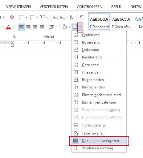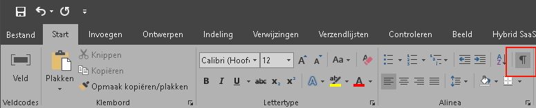 Deze is te vinden bovenin in word, hiermee kan het aan of uit gezet worden (dit word nooit meegenomen naar de pdf versie)