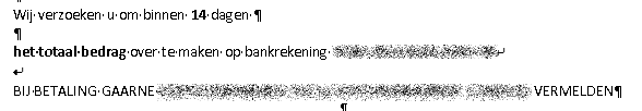 Het kan zijn dat er vreemde tekens op het sjabloon staan, dit kan uit gezet worden Met Alt F9 op de toetsenbord in te drukken (tegelijkertijd) word alles ingeklapt en met de P gaat de enters en spaties eruit Voorbeeld voor Alt F9 (nu staat het open)