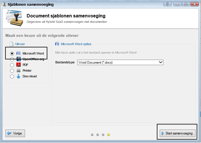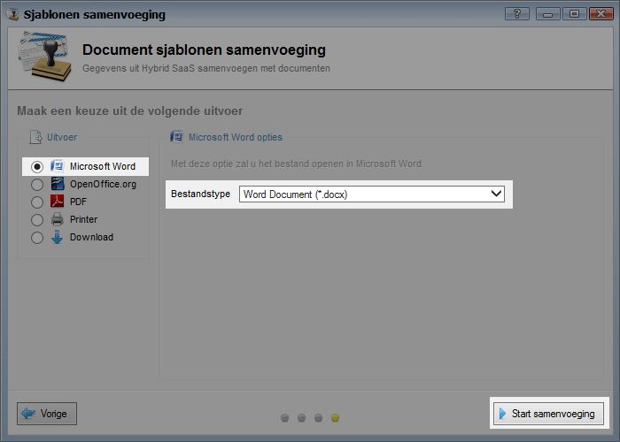 Zet het vinkje voor Microsoft Word, kies het bestandstype Word Document (*.docx) en klik vervolgens op Start Samenvoeging