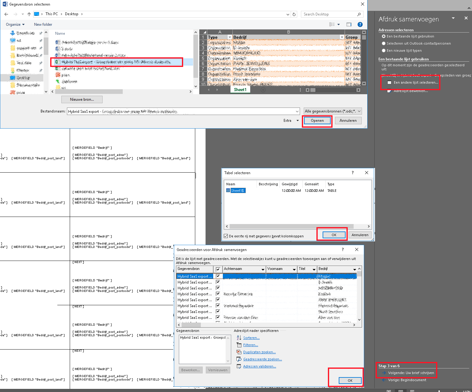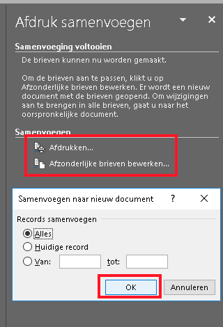• bij de melding geadresseerden voor afdruk samenvoegen kan er voor OK gekozen worden