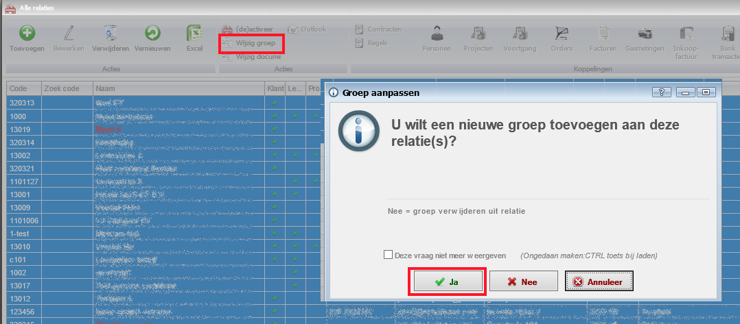 Maak een selectie van de betreffende relaties en kies voor wijzig groep, bij de melding moet er gekozen worden voor ja.