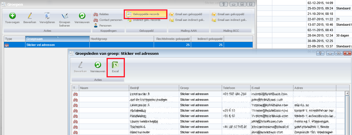 Ga naar groepen en kies voor gekoppelde records en kies en het nieuwe scherm voor Excel