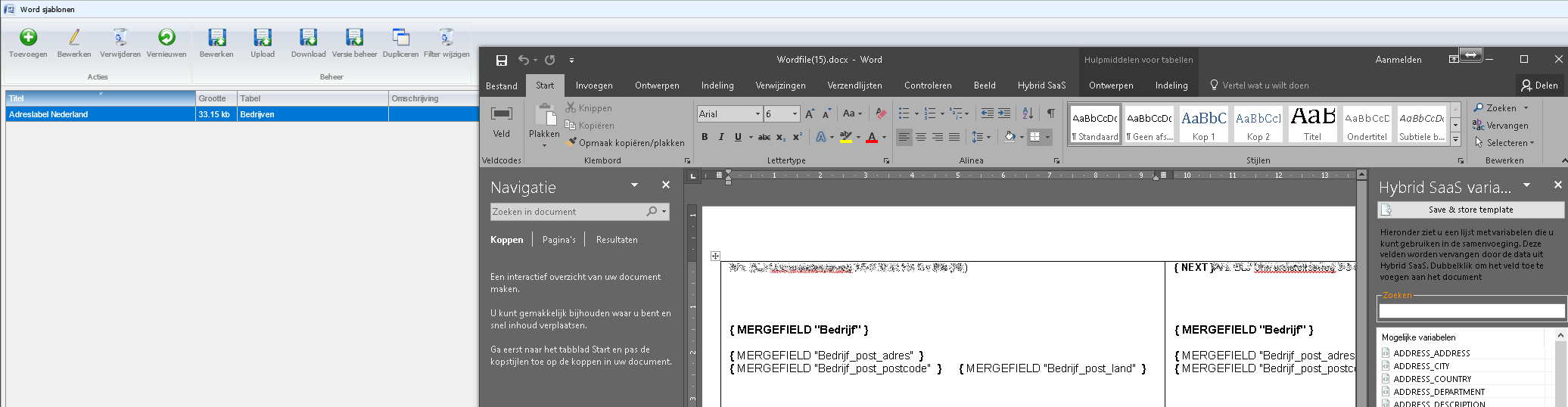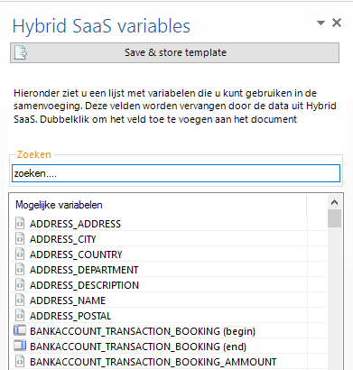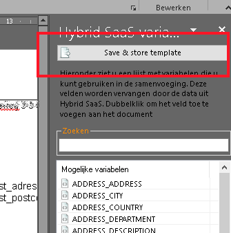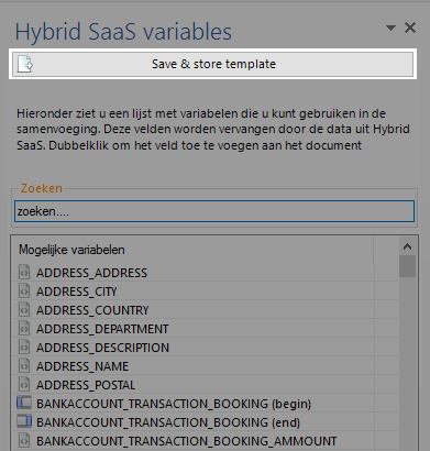 Indien het document naar wens ia aangepast dient het document worden geüpload in Hybrid SaaS. Klik rechtsboven in het Word document op Save & Store Template