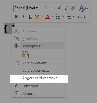 Met ALT+F9 is het mogelijk om de veldcodes weer te geven. Echter is het niet altijd wenselijk om alle codes uit het gehele document weer te geven. Door op een veldcode met de rechtermuisknop te klikken en voor de optie Andere veldweergave kan de veldcode zichtbaar worden gemaakt.