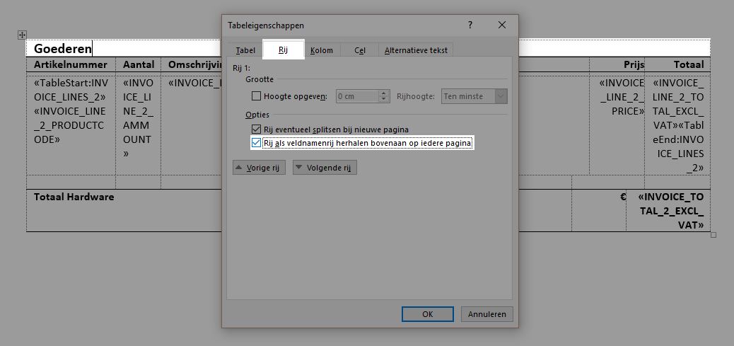 Klik met de rechtermuisknop op de rij welke herhaald dient te worden. Ga naar Tabeleigenschappen > Tabblad Rij > Zet het vinkje aan voor Rij als veldnamenrij herhalen bovenaan op iedere pagina
