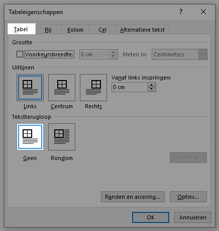 Klik met de rechtermuisknop op de tabel. Ga naar Tabeleigenschappen > Tabblad Tabel > Selecteer bij tekstterugloop Geen