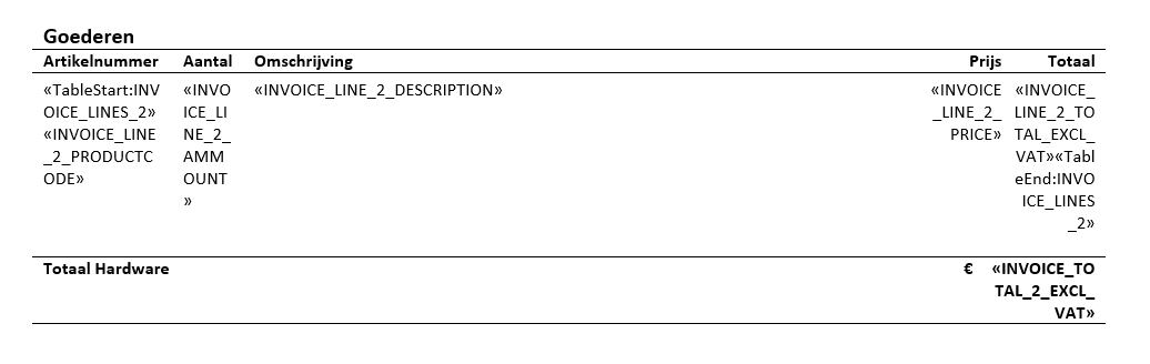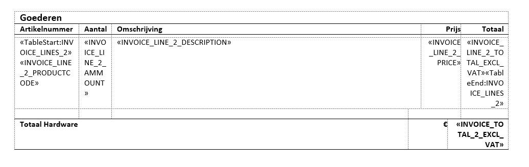 Velden welke op zichzelf staan zoals ADRES, FACTUURNUMMER, FACTUURTOTAAL. Velden welke herhaald worden zoals FACTUURREGELS en ORDERREGELS. Deze velden vallen onder een zogenaamde herhalingstabel. Dit betekent dat deze velden enkel werken als deze in een tabel staan en dat de tabel een MERGEFIELD TABLESTART: en MERGEFIELD TABLEEND: bevat.
